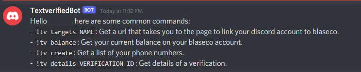 Currently, the Textverified features available on the bot are: get your balance, search for a service, create a verification, and check verification. You must have enough balance on your linked account in order to create a verification.