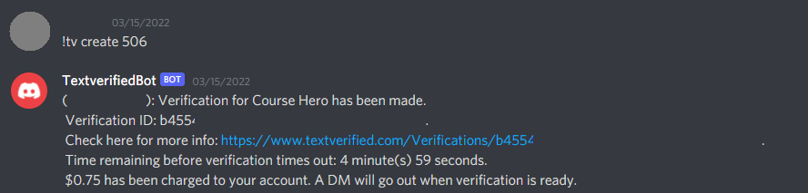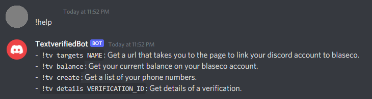 Textverified has created a Discord bot that lets you use Textverified features through Discord. The first step to using the discord bot is to link your Textverified account to discord. This is done through your account settings on Textverified at https://www.textverified.com/Manage/Index. There will be a blue button that says “Login with Discord”, you can click that and it will bring you to discord’s site to do an oauth to link to Textverified. Once linked, the button should be grayed out saying “Already linked with Discord”. The second step to using the discord bot is to invite the bot to a server. This will require you to have server privileges to add a bot to the server. Use this invite link to add the bot to the server of your choice: https://discord.com/api/oauth2/authorize?client_id=918225872471863416&scope=bot&permissions=68608