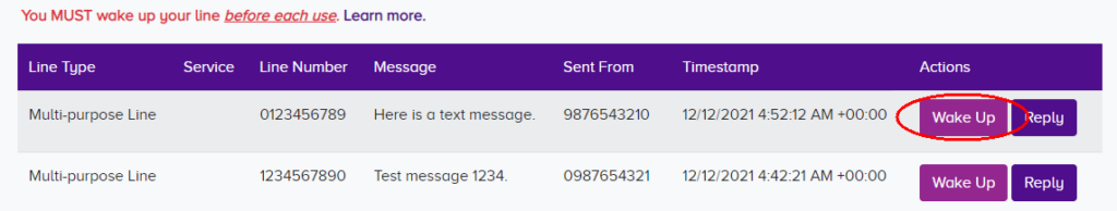 The Wake Up button will prepare a specific line for receiving messages. This button will also give back an estimated time on how long it will take for it to be ready, so that you can determine when to request a code or trigger a message to be sent to your line.